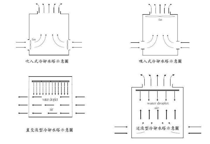 冷却水塔是将系统所热交换后回流之高温冷却水,经由分配管喷嘴洒在鳍片(FIN)表面上,同时与风扇(FAN)所 产生的强制对流冷空气相互接触,此时,热水与冷空气之间即产生显热热交换作用。少部分的热水被蒸发成气态水蒸气,而吸收蒸发潜热再度降低冷却水之温度而形成低温之冷却水回流至系统。然而,大部分冷却塔中,皆有一或多个螺旋桨或離心式风扇使空气铅直或水平地通过冷却塔,而以喷嘴喷水或使水沿冷却塔由一阻板向下洒到另一阻板,即造成很大的水面积。